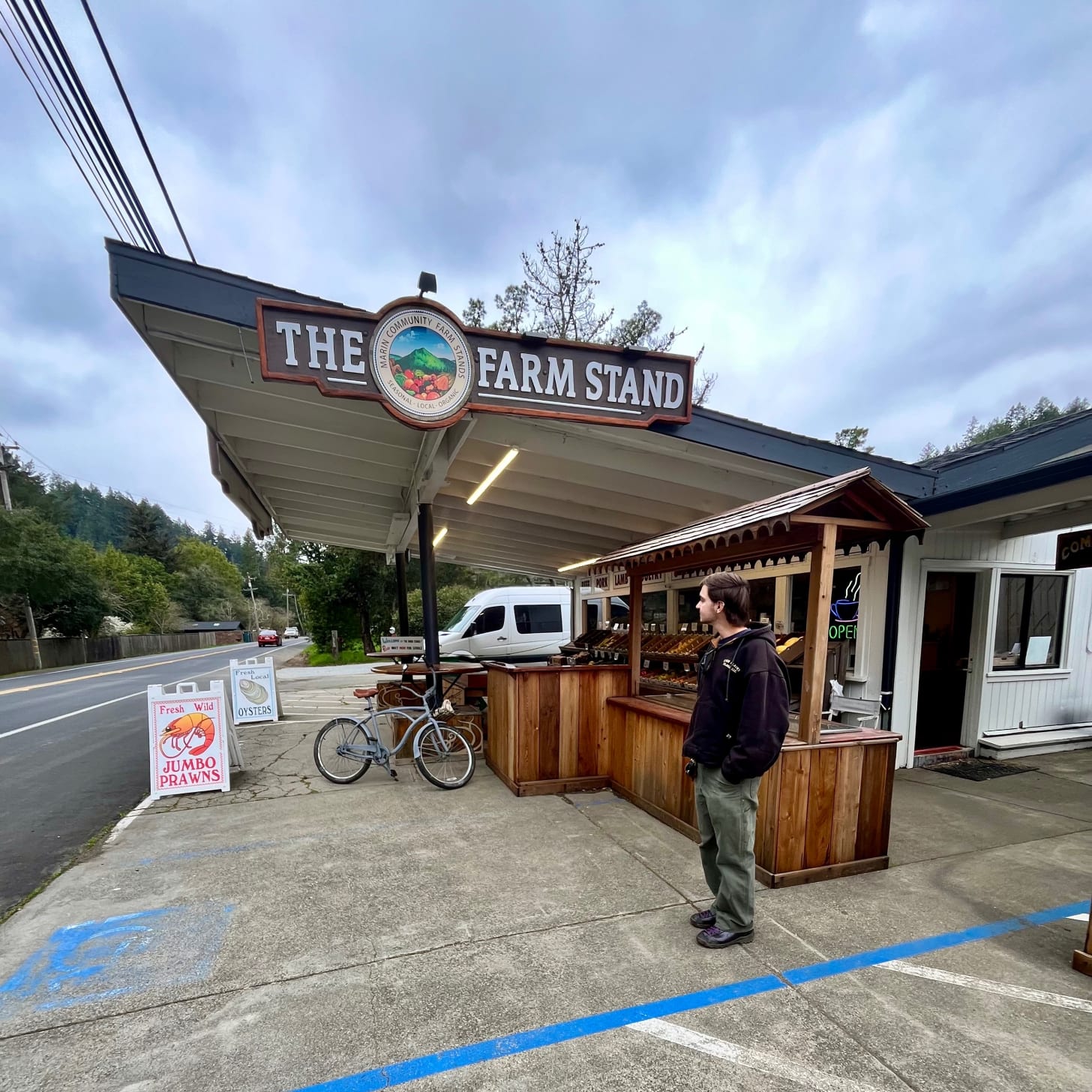 The Farm Stand catches my eye as we drive by, bins of fruits and veggies fronted by a sign for oysters from nearby Bodega Bay. How many times have I zoomed by a roadside stand, too busy to stop? Not today Satan. I yeet the whip around, skrrting the beast across three parking spaces out front.