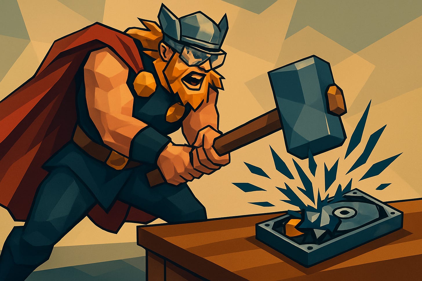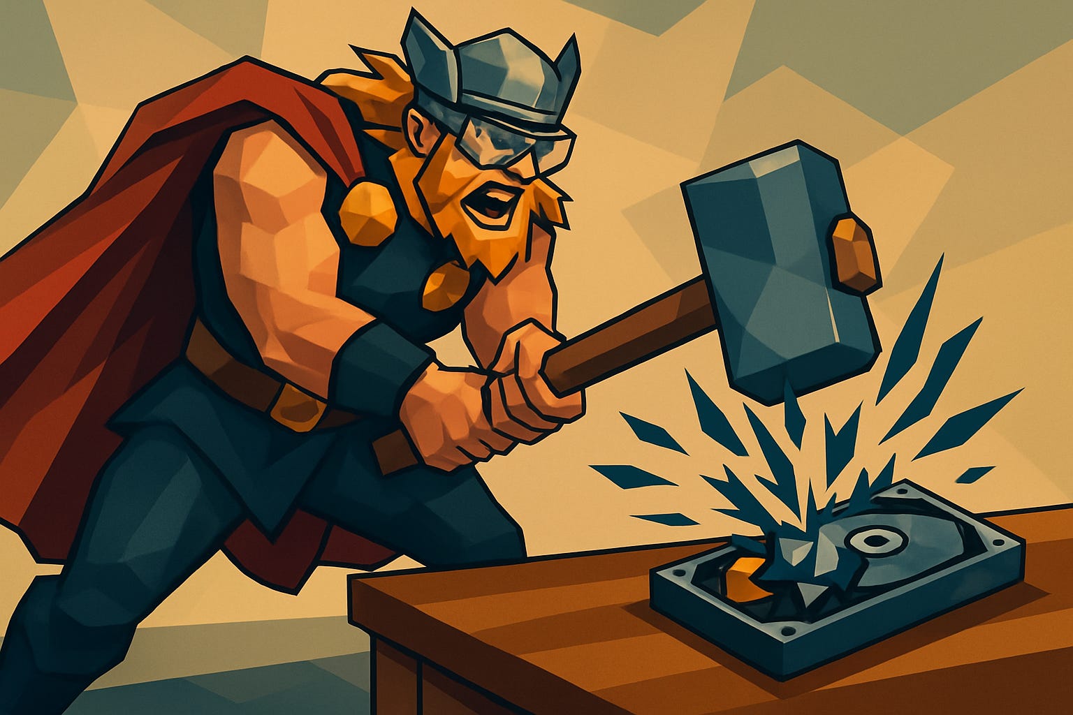 It took me twenty minutes to find where I’d stashed the sledgehammer, but once I did, I fell into a groove: uncover hard drive, crack it open, bash with sledgehammer, feel like Thor.