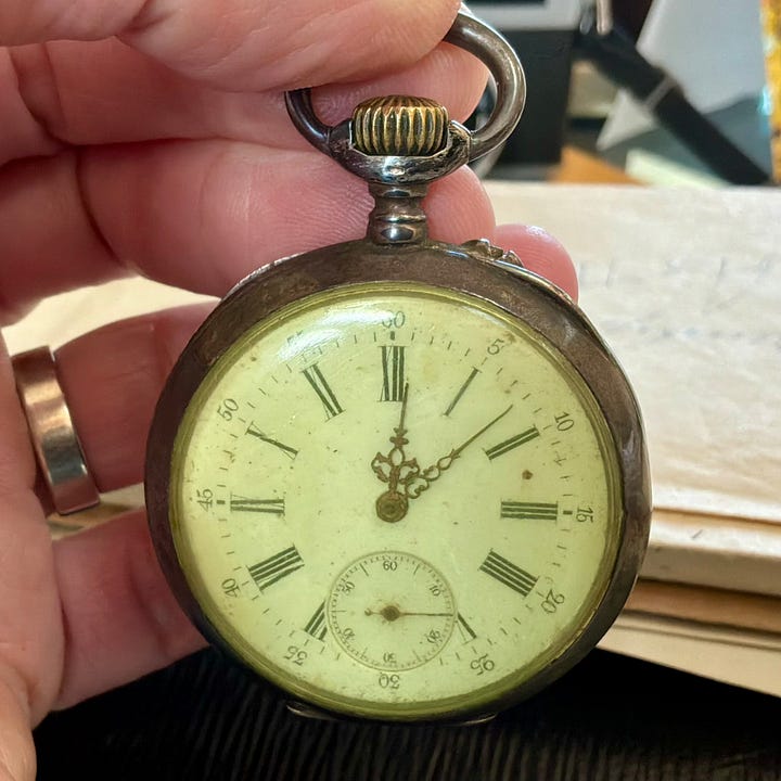 Something else came flying out of that cigar box: a pocket watch from the 1910s. Young Arthur must have carried this watch with him during the war. The face is glass, scratched and worn from use. It’s heavy and silver. I wound it and set it; it still tells time.