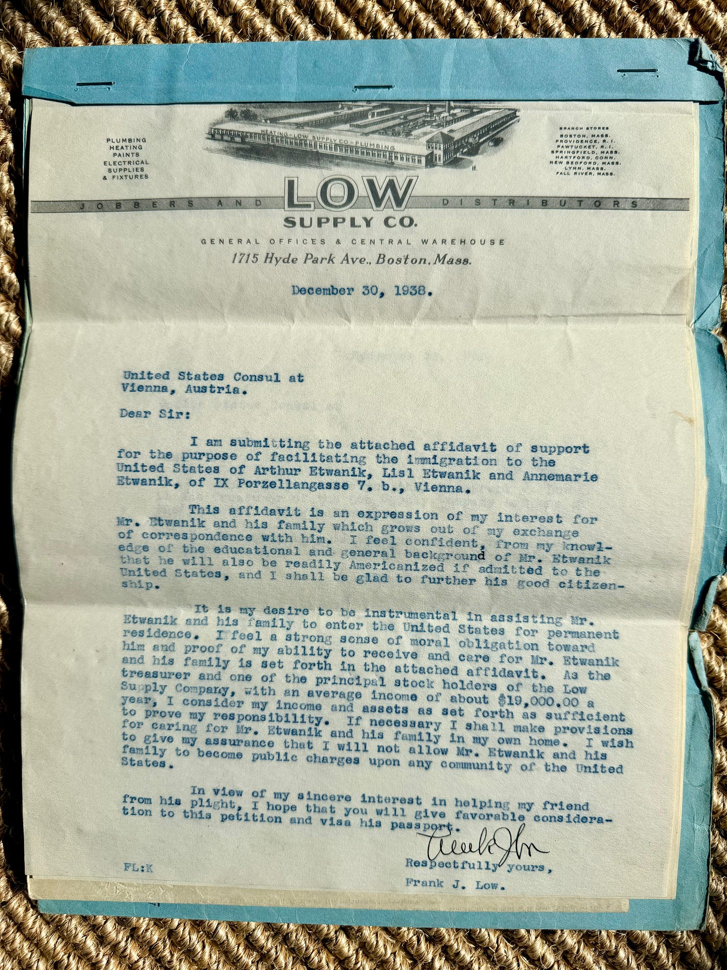 This is the cover letter of the affidavit from an officer of the Low Supply Company in Boston sponsoring my Grandpa so he could escape: