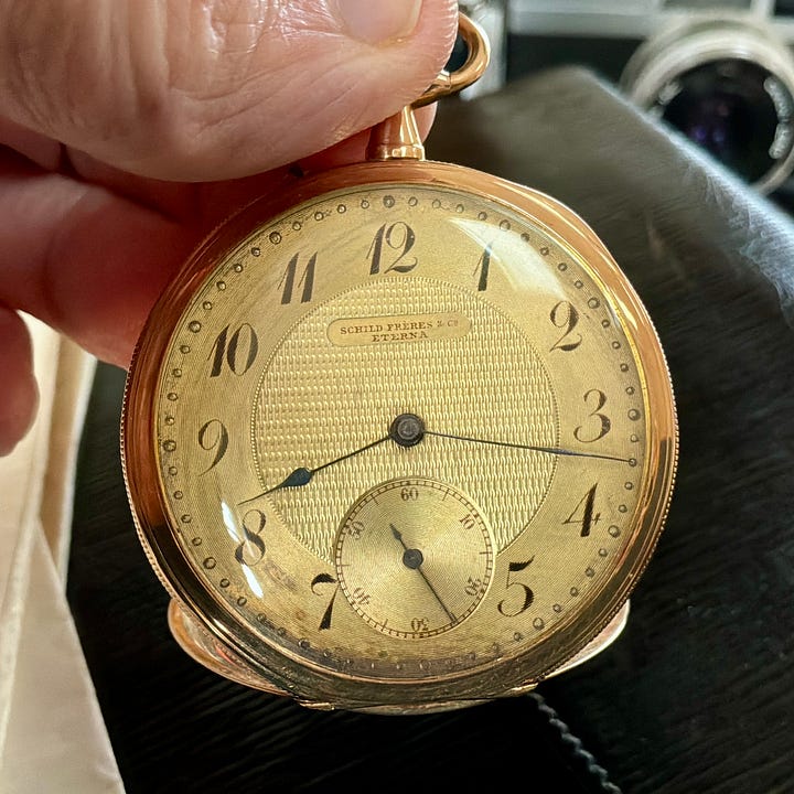 I have another watch of Arthur’s that he had given my dad, and that my dad had passed on to me. It’s gold and lighter and fancier, and it dates later, in the 1920s. I imagine an older Arthur carrying this one after WWI when he was a proud dad — married and working in Vienna.