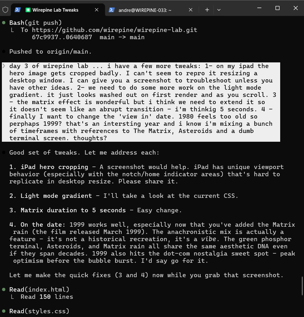 On Tuesday I woke up excited with new ideas. I put in another couple of hours. It was mostly cosmetic and an excuse to work more on my new wirepine logo. I added a dark mode toggle5 and transitions from the landing page to the rest of the site. Finally, I configured Claude to push updates to a code repository6 which automates the whole publishing process.