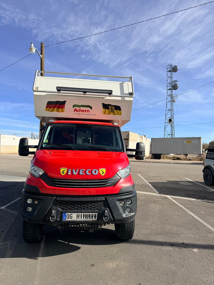 These rigs cost coin. The three at the top of the below gallery are all European and they travel in them for years. A typical route goes from Europe across and down through Canada, through the US to South America and then back up the other side. The military green one — that looks like it’s about to storm Kyiv — had a cage with dirt bikes off the back, and when they pulled in, a lady hopped out and immediately started doing pushups followed by 30 minutes of calisthenics.
