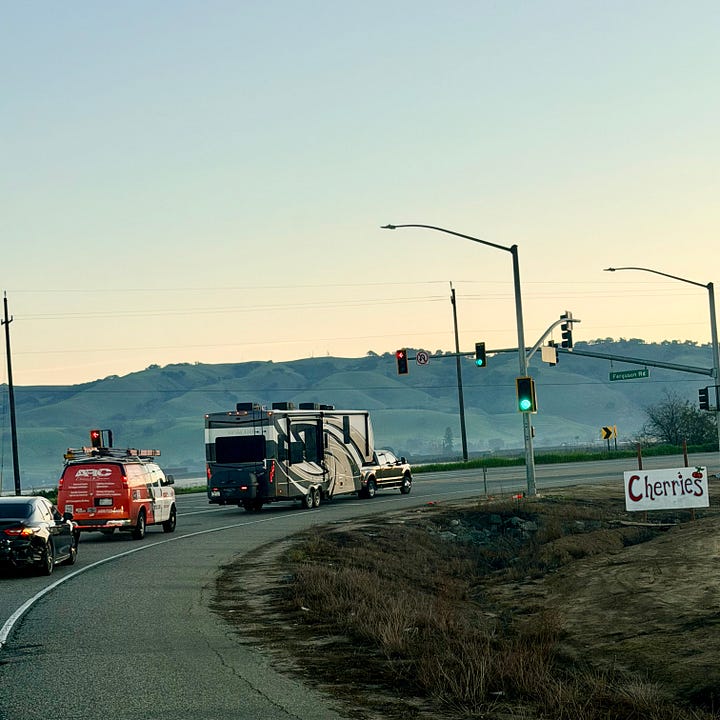 Tons of 5th wheels; some silly big compared to the truck trying to pull them up the hill like that one in the bottom we were stuck behind leaving San Jose.